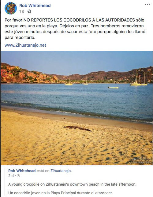 En tanto en playa Principal, fue visto un cocodrilo que estuvo asoleándose en la arena, sin embargo a pesar de que ese balneario natural está cerrado algunas personas avisaron al departamento de bomberos para que fuera retirado el saurio. El vecino, Rob Whitehead, quien tomó la fotografía, pidió a los ciudadanos que no molesten a los cocodrilos y no los reporten.