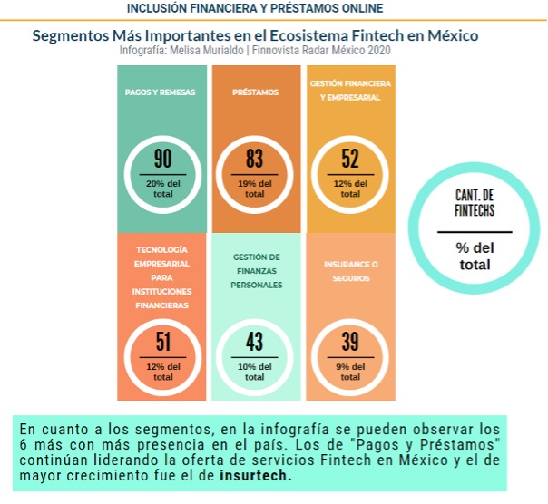 Se puede visualizar, que el mayor porcentaje de fintechs en México está concentrado en Pagos y Préstamos, específicamente en préstamos online.