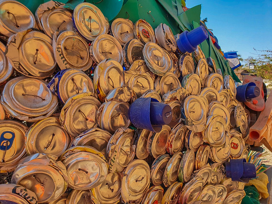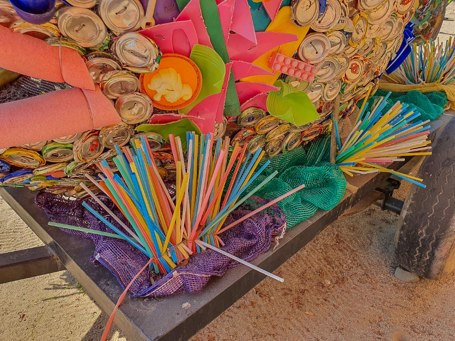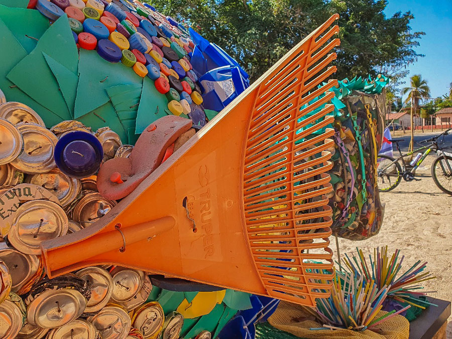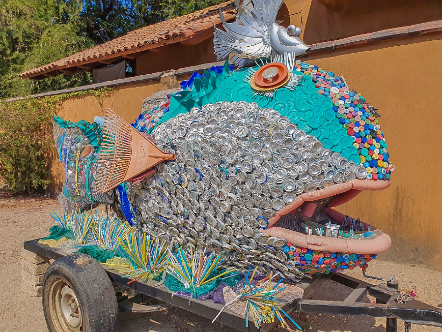 La escultura es de alrededor de dos metros y está montada sobre un remolque; para ello usaron botellas de cloro, pet, tapas de garrafones de agua, tapas de botellas de pet, latas de aluminio de refresco y cerveza, popotes, arpillas y costales, suelas de sandalias, platos y vasos.
