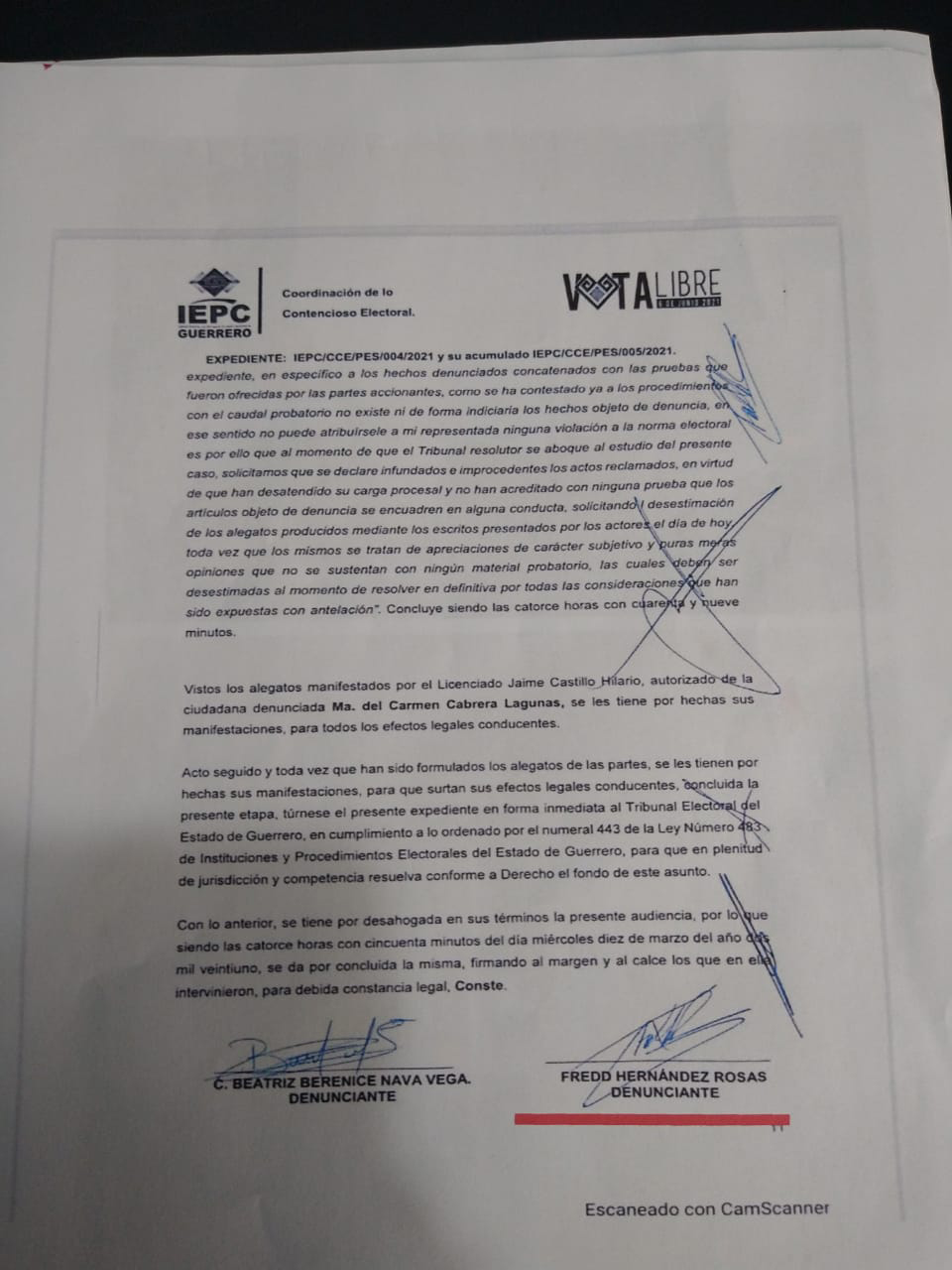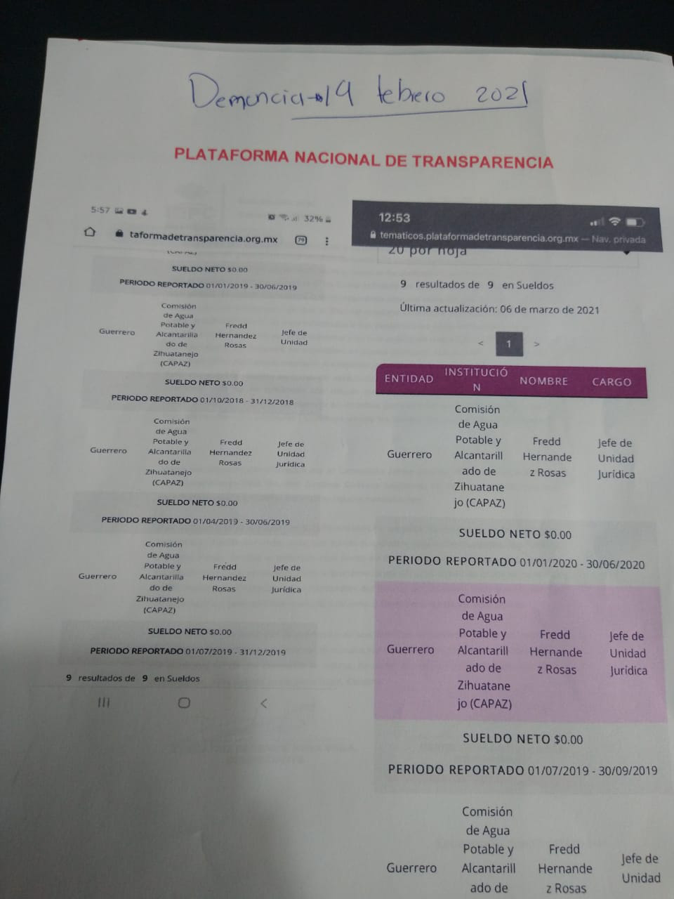aparecen sus nombres y firmas en el documento oficial del IEPC, mostró fotografías de ellos y el resultado de la plataforma de transparencia a nivel nacional donde dice que Fredd Hernández Rosas es el jefe de la Unidad Jurídica de la Comisión de Agua Potable y Alcantarillado de Zihuatanejo (CAPAZ), que hasta este 16 de marzo de 2021 aparecen en nómina del ayuntamiento de José Azueta, desde el 2018 al día en mención.