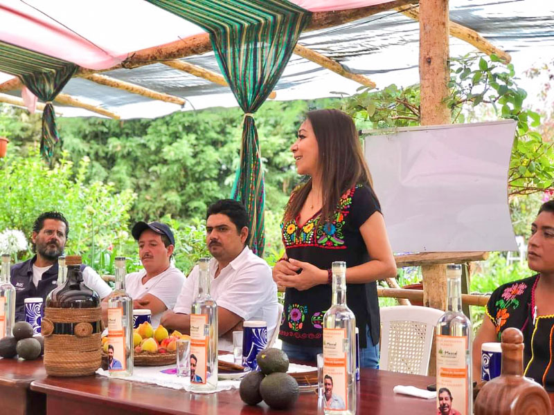 La diputada federal con licencia, Maricarmen Cabrera Lagunas, se hizo acompañar por el presidente del Consejo Regulador del Mezcal, Hipócrates Nolasco Cancino, y los clientes compradores para catar los mezcales que se venderán en la cadena de negocios.