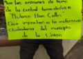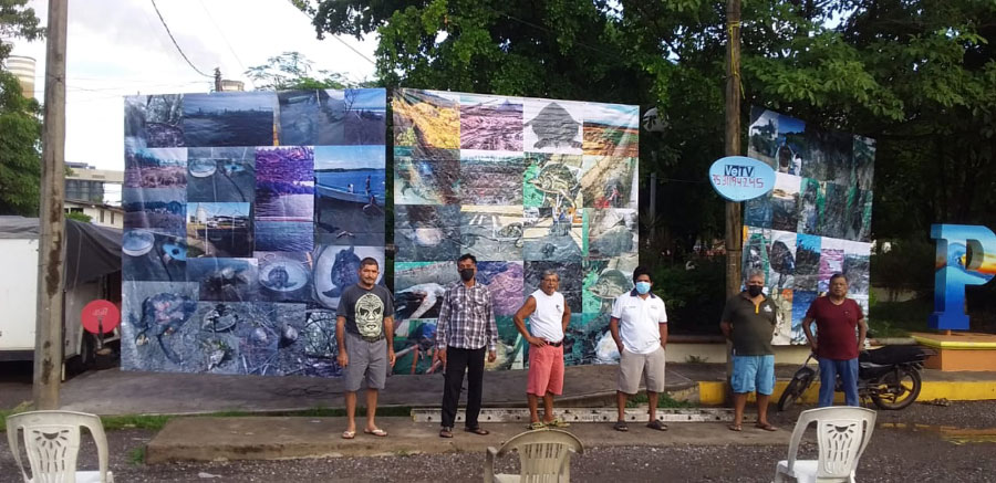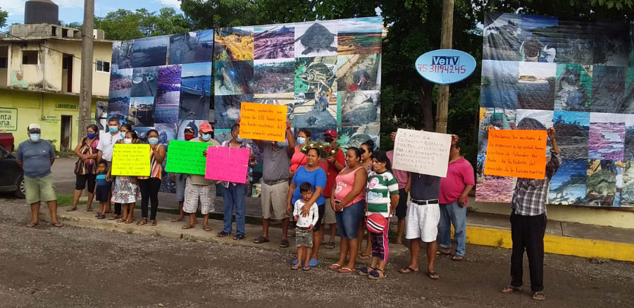 Mantienen un par de lonas donde muestran alrededor de 40 fotos donde se pueden ver afectaciones ambientales entre las que destaca la mortandad de tortugas y afectación al estero y al mar.