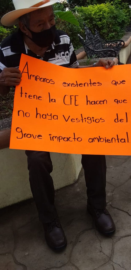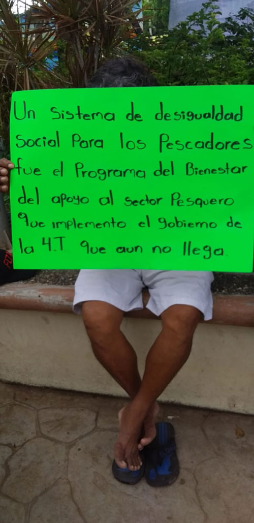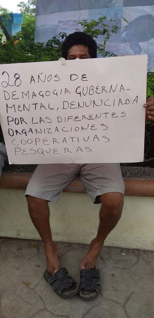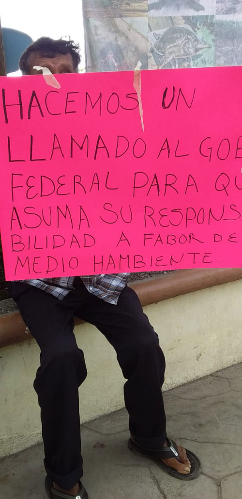 Además mostraron pancartas: “hacemos un llamado al gobierno federal para que asuma su responsabilidad a favor del medio ambiente”; “28 años de demagogia gubernamental denunciada por las diferentes organizaciones cooperativas pesqueras”; “amparos de la CFE hacen que no haya vestigios del grave impacto ambiental”.