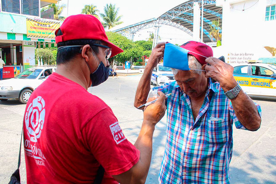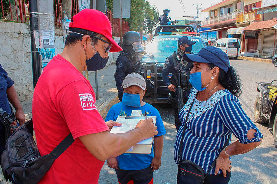 Petatlán, Gro.- Elementos policiales y de Protección civil, iniciaron la operación en la cabecera municipal de Petatlán para solicitar a los ciudadanos que porten el cubrebocas, ya que a los reincidentes se les aplicará la medida de trabajo comunitario.