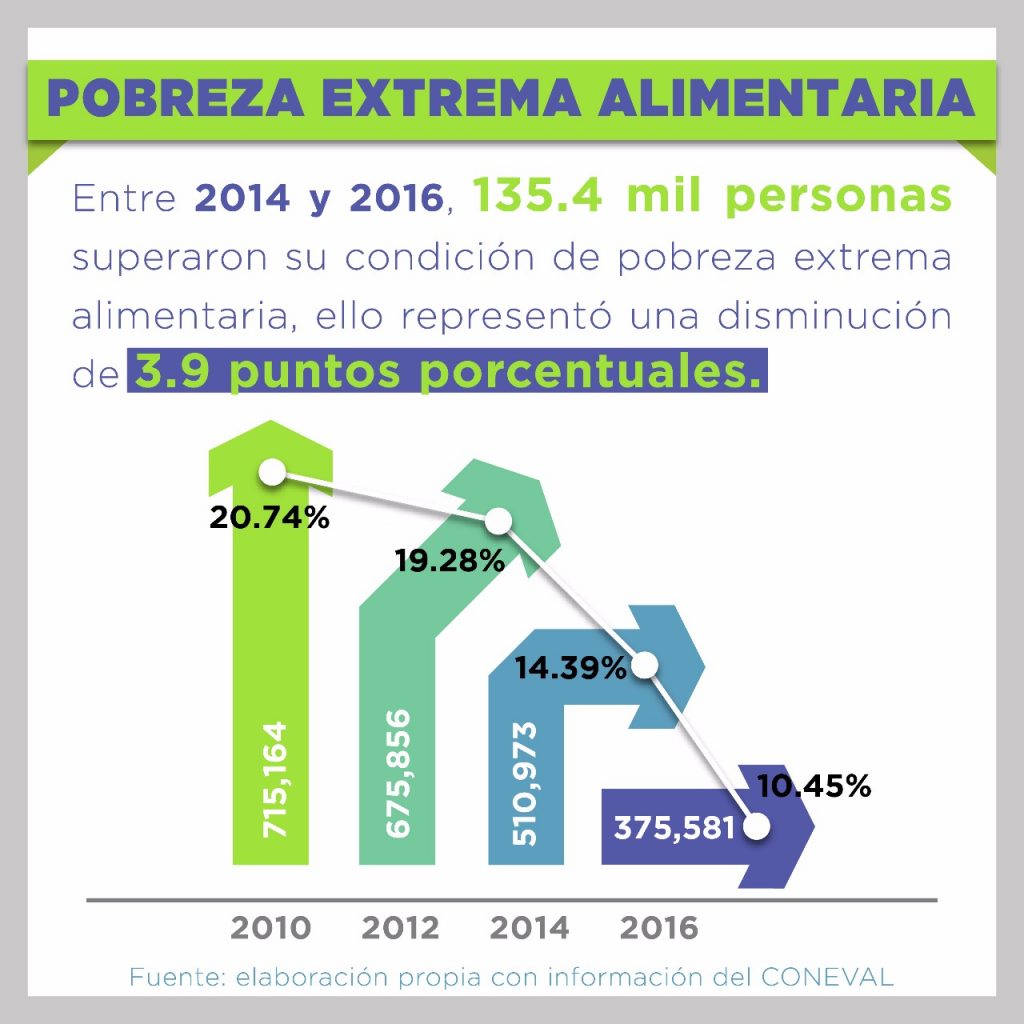 Tras dos años de encabezar el gobierno de Guerrero, Héctor Astudillo Flores los resultados de la correcta y transparente aplicación de los recursos en acciones como en vivienda, obra pública, combate a la pobreza extrema y el rezago social se confirma con las cifras dadas a conocer por el Consejo Nacional de Evaluación de la Política de Desarrollo Social (Coneval), que indico que entre 2014 y 2016 en Guerrero, más de 135mil personas superaron la pobreza alimentaria extrema en esta entidad, representando una disminución de 3.9 puntos porcentuales.