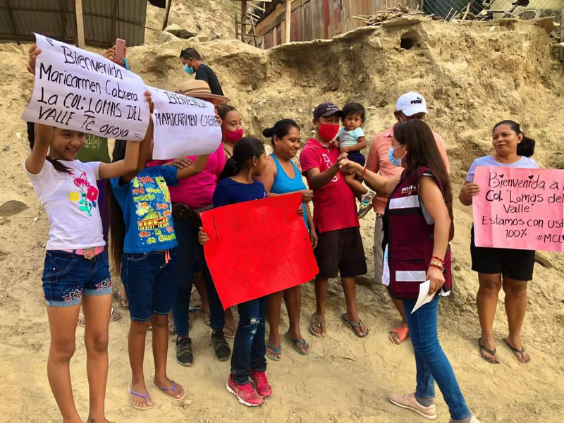 En la colonia Lomas del Valle, las familias le mostraron a la candidata de Morena las condiciones en las que viven, con casas de madera, hueso de palma, tapadas con plásticos para no mojarse, muros de llantas y calles de terracería con polvo suelto; les habló del proyecto más grande de vivienda que se aplicará en el puerto, para beneficiar a 5 mil familias, que aseguró esta colonia será de las principales en ser beneficiadas.