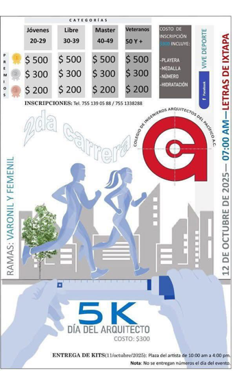 Zihuatanejo, Gro.- Este domingo 12 de Octubre se realizará la 2da Edición de la Carrera Atlética 5KM “ Día del Arquitecto” 2025.