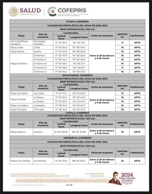 Como es habitual, COFEPRIS lleva a cabo la revisión de las playas de todo el país antes de los periodos vacacionales con mayor afluencia de turistas. En esta ocasión, el pasado 22 de marzo, se dieron a conocer los resultados de la revisión previa a Semana Santa. De las 289 playas evaluadas en 76 destinos turísticos de 17 estados costeros, únicamente seis excedieron los límites máximos de enterococos permitidos para el uso recreativo de las playas, siendo cuatro de ellas ubicadas en Baja California y dos en Acapulco. Estos datos confirman que el trabajo constante realizado en nuestro destino turístico es efectivo y da buenos resultados.