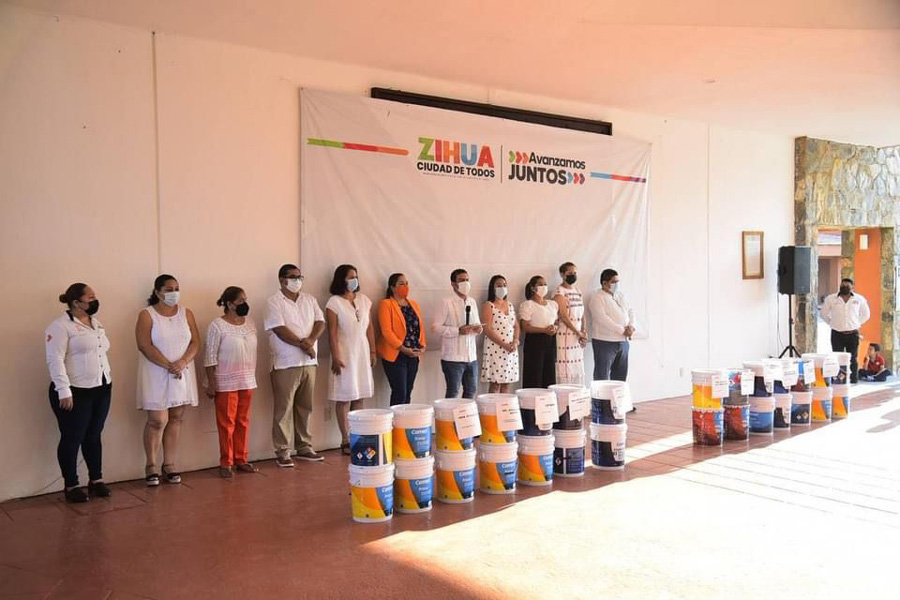 Zihuatanejo, Gro.- El presidente Jorge Sánchez Allec, acompañado de integrantes de la Comuna, recibió este lunes por parte de la Fundación Merza, representada por la gerente Yanet Hernández Vega, una importante dotación de material de pintura en apoyo de 11 escuelas de nivel básico a medio superior de esta zona de la región Costa Grande, lo que permitirá mejorar la imagen de los planteles educativos beneficiados.