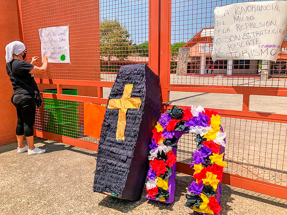 Se trata de un grupo pequeño de representantes de restaurantes de zonas de playa, quienes pidieron a las autoridades que se les de apoyo o despensas. En el portón del ayuntamiento los manifestantes colocaron pancartas y dos cajas de cartón forradas que con figuras de un ataúd y una corona floral, para representar la situación económica de los prestadores de servicios.