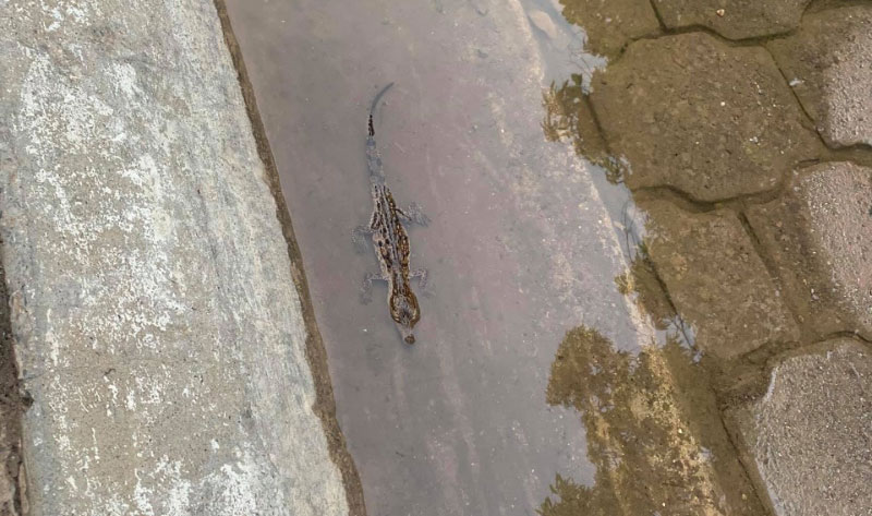 Se trata de un saurio que estaba en agua que dejó la lluvia en la calle Paseo de las Golondrinas, cerca del campo de golf, el cual fue rescatado por Vladimir Cabañas Díaz, quien lo retornó a su hábitat natural.